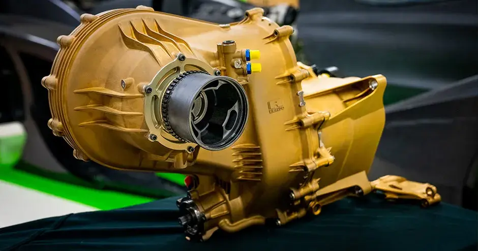 ギアボックスの最適化の最初のステップは、ギアボックスのメーカーとして名高い Ricardo 社と共同でカスタムデザインを作成することでした。積層造形の採用後の 3D Systems との広範な作業に続いて、Rodin Cars 社はそこで得た知識を Ricardo 社と共有して、積層造形によってのみ得られる利点や設計・製造能力を伝えました。Rodin Cars 社は非常に特有のギア比や筐体寸法を必要とし、積層造形によってのみそれが可能であることがわかっていました。余分な質量を取り除くことも最優先事項で、場所によっては肉厚を 2 mm まで削減しました。両社は協力して最適化された形状に対して部品を設計して、その後、Rodin Cars 社は内部のギャラリーや流路を統合して最終的なギアボックスの設置面積を 400mm x 650mm x 300mm まで削減しました。