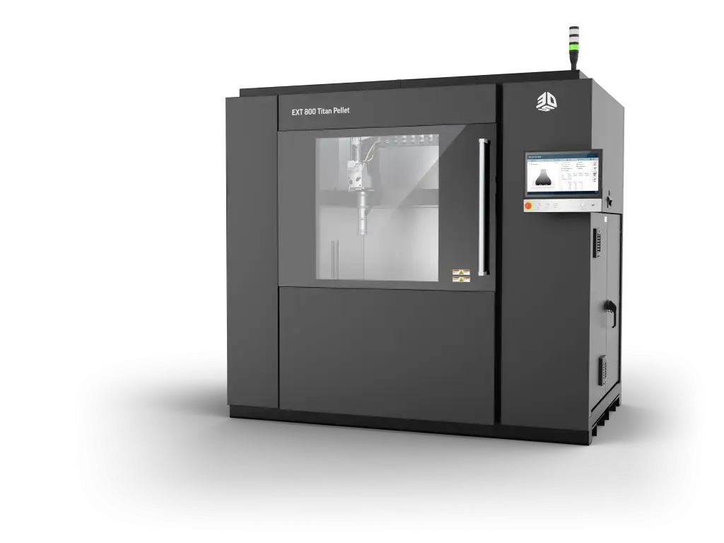 EXT 800 Titan Pellet は、単一の押出ツールヘッドと洗練された工業デザインにより、オフィス、研究所、大学、大規模工場など、幅広い製造環境に最適です。このプリンタはフレームがコンパクトなため、標準的な両開きドアを通過でき、搬入や設置が容易です。また、この装置には大型のフロントタッチスクリーンが搭載されており、直感的なユーザエクスペリエンスを実現しています。